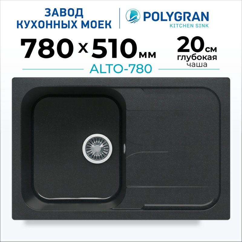 Мойка Alto 780 Polygran - прекрасно смотрится на современной кухне. Изготовлена из искусственного камня, что обуславливает бесшумность и долговечность. Ее глубина позволяет мыть габаритную посуду без брызг. Поверхность покрыта защитным покрытием Gelcoat, что делает ее непористой. На ней не остается жирного налета, она не впитывает неприятный запах.