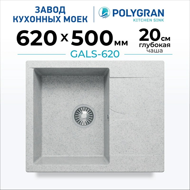 Мойка Gals 620 Polygran - прекрасно смотрится на современной кухне. Изготовлена из искусственного камня, что обуславливает бесшумность и долговечность. Ее глубина позволяет мыть габаритную посуду без брызг. Поверхность покрыта защитным покрытием Gelcoat, что делает ее непористой. На ней не остается жирного налета, она не впитывает неприятный запах.