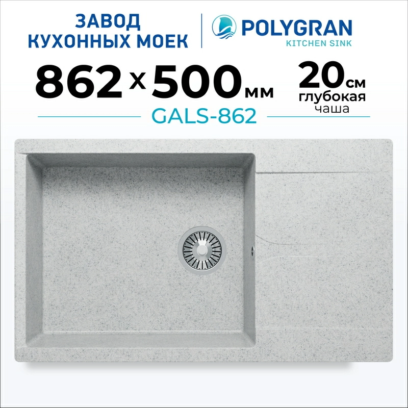 Мойка Gals 862 Polygran - прекрасно смотрится на современной кухне. Изготовлена из искусственного камня, что обуславливает бесшумность и долговечность. Ее глубина позволяет мыть габаритную посуду без брызг. Поверхность покрыта защитным покрытием Gelcoat, что делает ее непористой. На ней не остается жирного налета, она не впитывает неприятный запах.