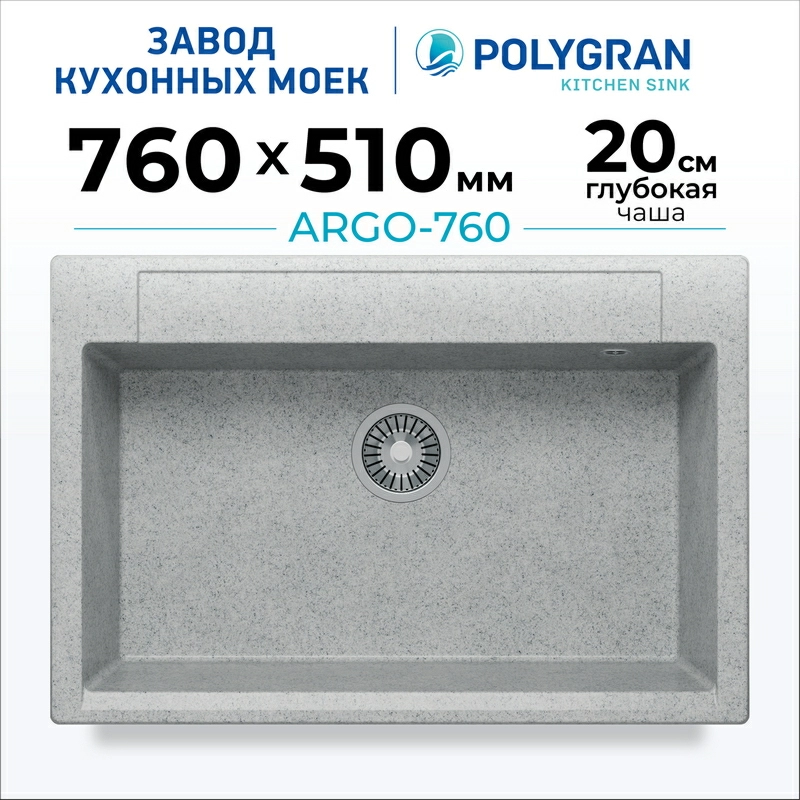 Мойка Argo 760 Polygran – лаконичная модель для изысканного интерьера. Изготовлена из искусственного камня, что обуславливает бесшумность и долговечность. Ее глубина позволяет мыть габаритную посуду без брызг.