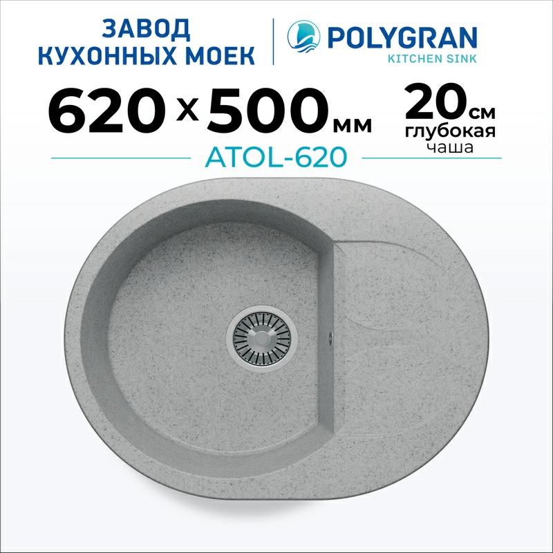 Мойка Atol-620 Polygran – вместительна и удобна в эксплуатации. Ее глубина позволяет мыть габаритную посуду без брызг. Изготовлена из искусственного камня, что обуславливает бесшумность и долговечность.