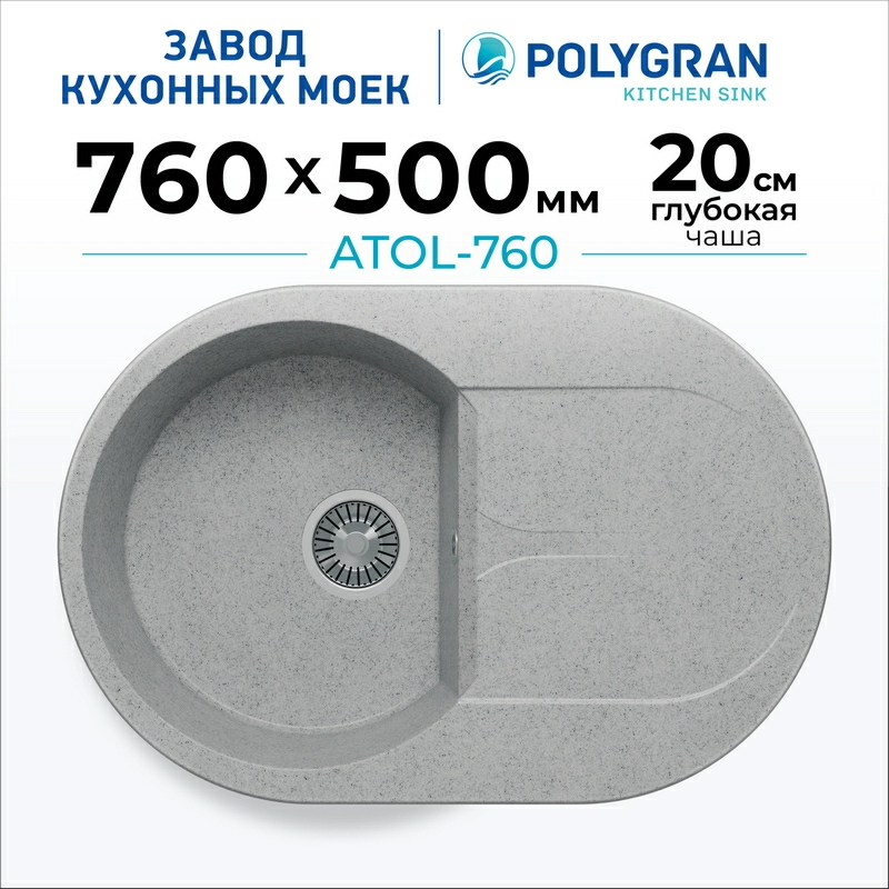 Мойка Atol-760 Polygran – вместительна и удобна в эксплуатации. Ее глубина позволяет мыть габаритную посуду без брызг. Изготовлена из искусственного камня, что обуславливает бесшумность и долговечность.