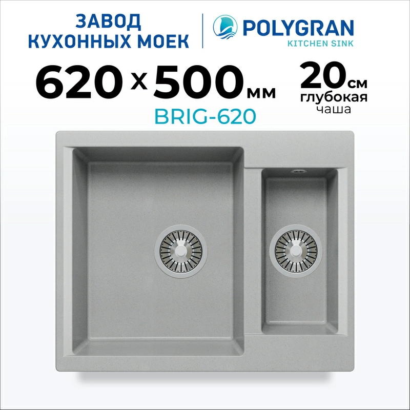 Мойка Brig-620 Polygran – вместительна и удобна в эксплуатации. Модель объединяет в себе основную и дополнительную чаши. Ее глубина позволяет мыть габаритную посуду без брызг. Изготовлена из искусственного камня, что обуславливает бесшумность и долговечность.