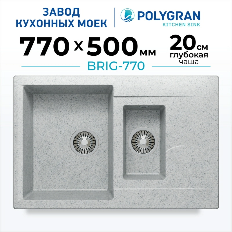 Мойка Brig-770 Polygran – вместительна и удобна в эксплуатации. Модель объединяет в себе основную и дополнительную чаши. Ее глубина позволяет мыть габаритную посуду без брызг. Изготовлена из искусственного камня, что обуславливает бесшумность и долговечность.