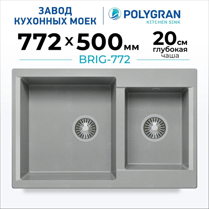 Мойка Brig-772 Polygran – вместительна и удобна в эксплуатации. Модель объединяет в себе основную и дополнительную чаши. Ее глубина позволяет мыть габаритную посуду без брызг. Изготовлена из искусственного камня, что обуславливает бесшумность и долговечность.