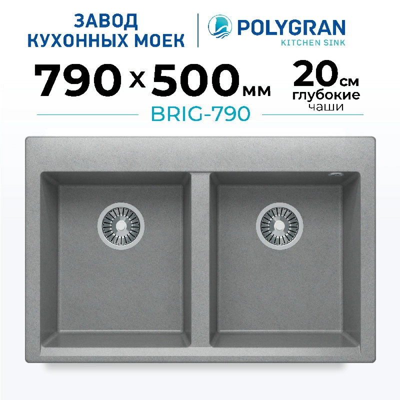 Мойка Brig-790 Polygran – вместительна и удобна в эксплуатации. Модель объединяет в себе основную и дополнительную чаши. их глубина позволяет мыть габаритную посуду без брызг. Изготовлена из искусственного камня, что обуславливает бесшумность и долговечность.